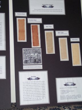 To the upper right is the display of various tools used to make the fiber. It took a year from the time of the first planting of the flax seed, to harvesting, to drying, then moistening the fiber to pound the dickens out of it, then combing it repeatedly to soften & straighten, to finally spinning a fiber that would eventually be woven into a linen fabric that would be used to create a single shirt. It was an amazing amount of work -- there was no running to your local yarn shop for a skein of yarn or ball of thread! (It would be almost 20 years later that cotton, due to the invention of the Cotton Gin, would become the fiber/fabric of choice.)